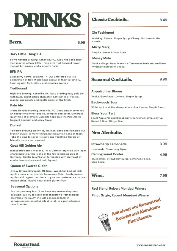 At Roamstead, we try to make your camping adventure as easy as possible. Linens are provided for your comfort. We also have a camp store with snacks, beverages, and camping gear. For meals, we have an onsite restaurant serving breakfast and pizza. Firewood and ice are also available for purchase form our camp store. Be sure to pack your adventure gear, like hiking shoes, backpack, and weather appropriate clothing. The Smokies are a temperate rainforest, so bring your rain jacket just in case! During the summer months, there are plenty of opportunities for water fun, from the on-site pool, to white water rafting, tubing, rock hopping, and water parks. So, swimsuits are a must!